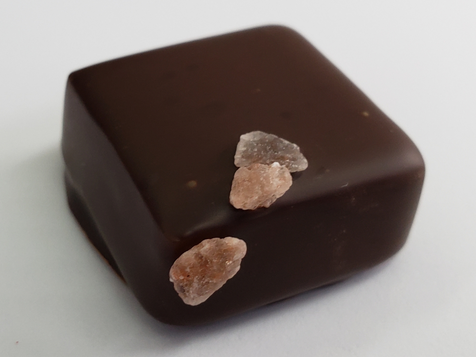 Homemade caramels coated with dark chocolate and sprinkled with sea salt.